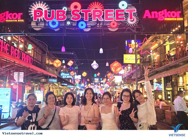 Kết thu một ngày thăm quan từ thủ đô đến cố đô bằng một buổi tối đi dạo tại chợ đêm Siem Reap. Những con phố bán hàng thủ công, nhà hàng, quán bar, pub sập sình huyên náo nơi đây là chúng tôi phấn khích. Đồ uống tại những quán Pub view tuyệt đẹp với giá rất rẻ không hề đắt đỏ như những con phố đi bộ đêm ở các nước khác.