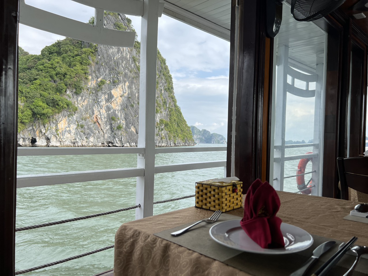 Bữa trưa sẽ diễn ra trên tàu cùng với các món cao cấp phục vụ chuyên nghiệp sang chảnh, nếu có yêu cầu gì thêm bạn có thể liên hệ với nhân viên trên tàu hay hướng dẫn viên đồng hành cùng mình trong tour du lịch.